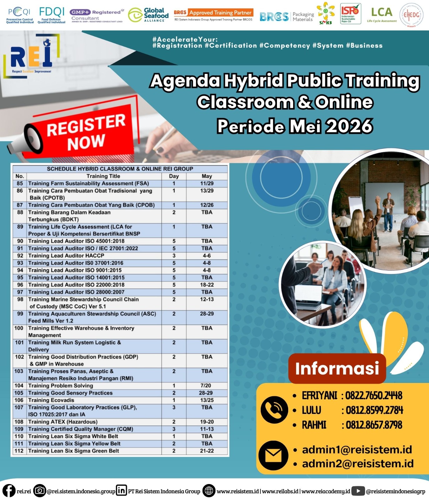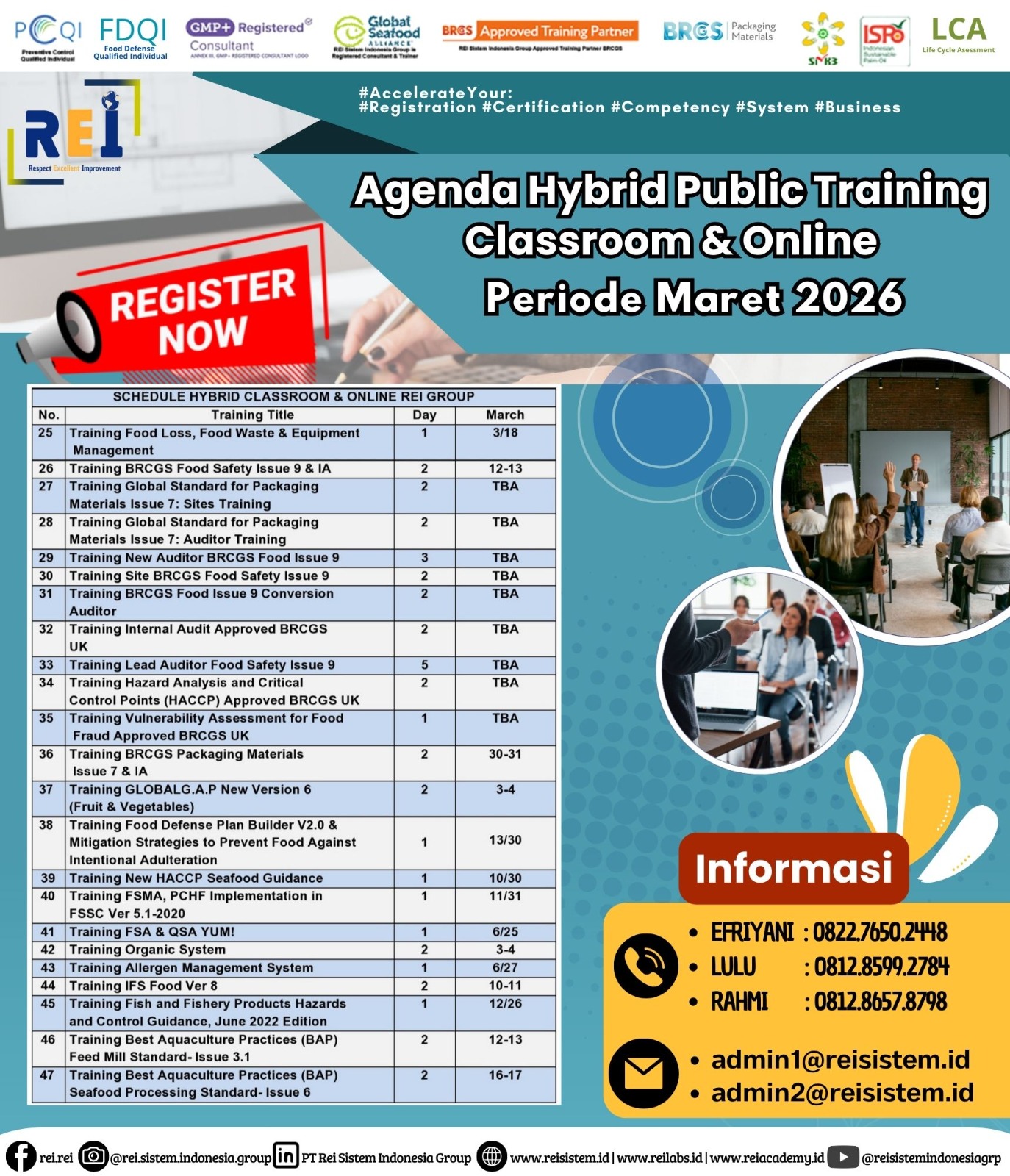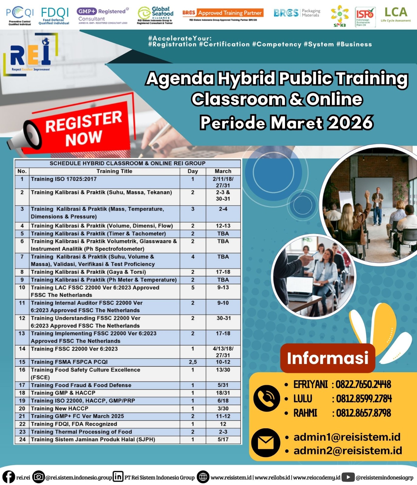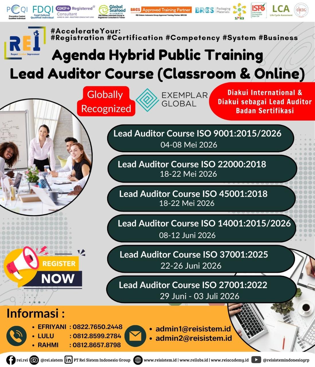 We can support many personnel certification such as PCQI US FDA Recognized, FSSC Lead Auditor Approved FSSC Netherlands, Lead Auditor IRCA CQI, SMK3,etc .