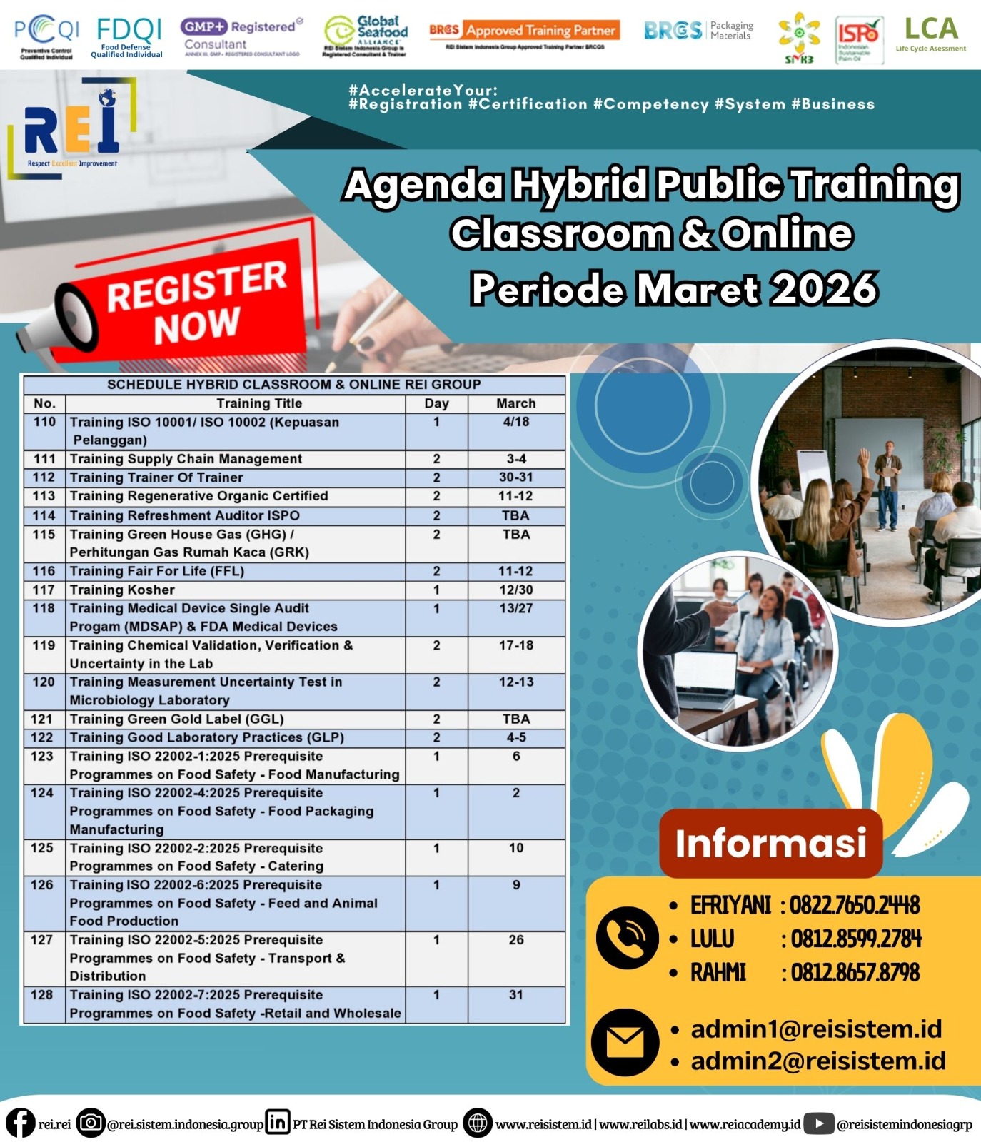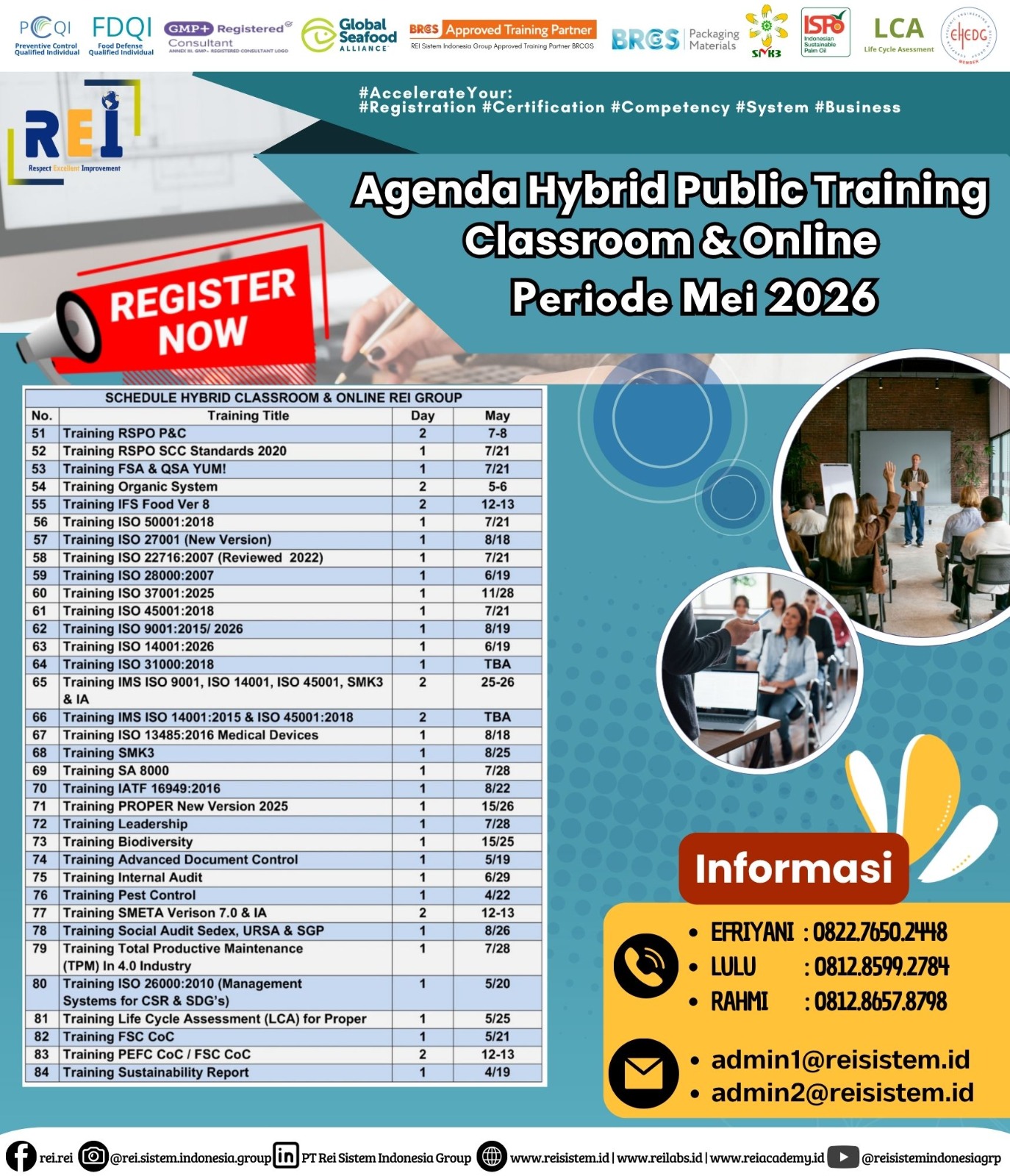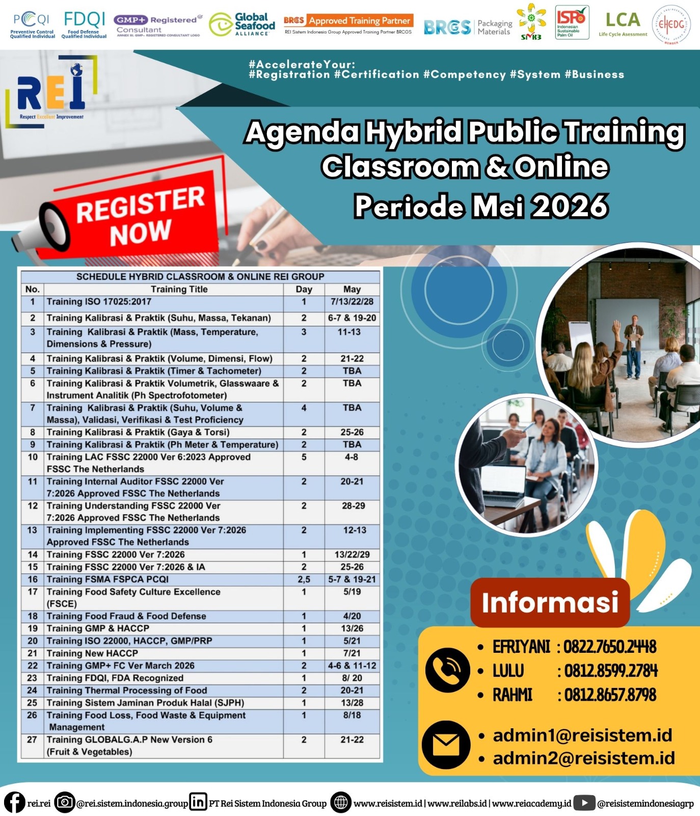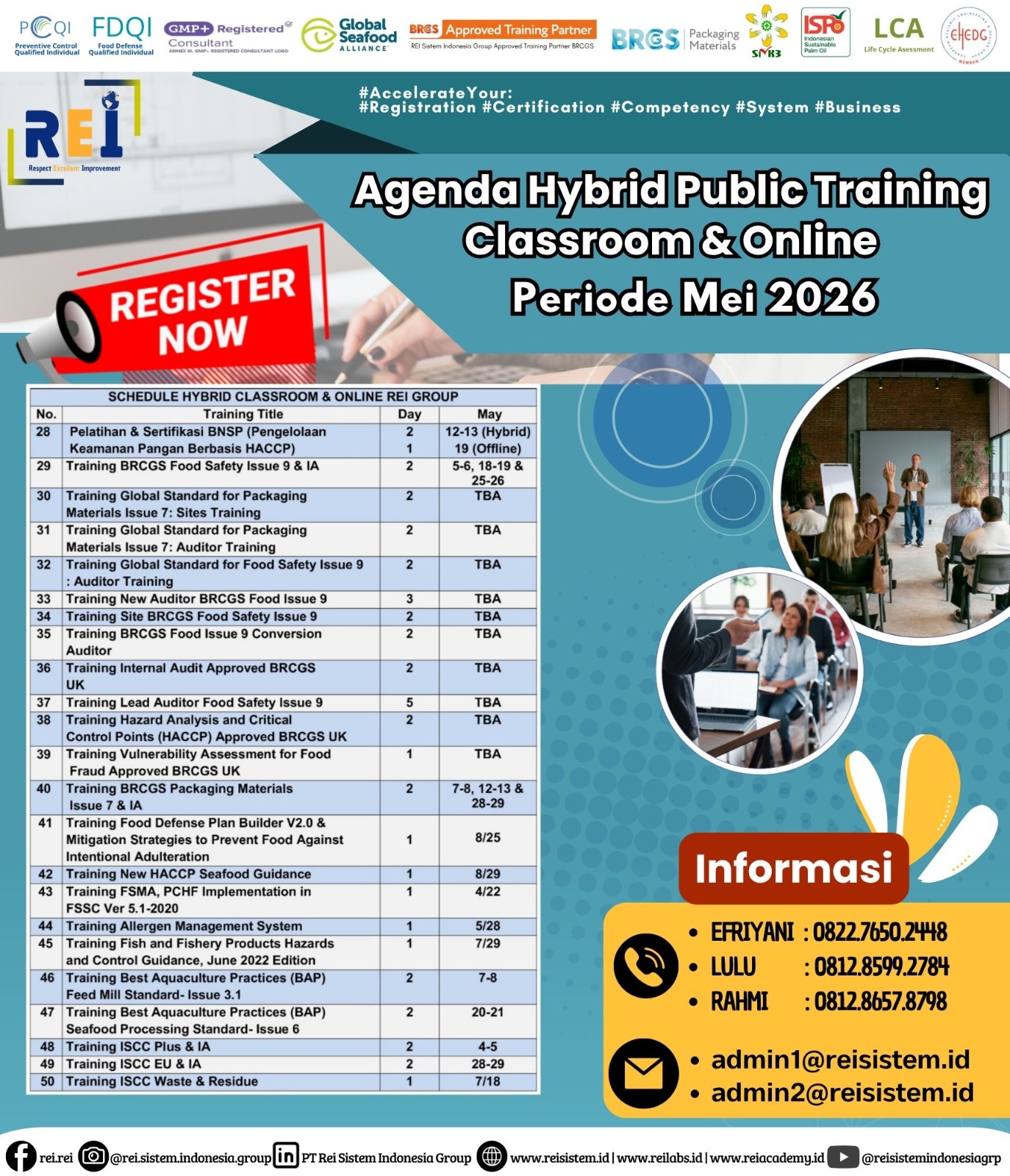 We can support many personnel certification such as PCQI US FDA Recognized, FSSC Lead Auditor Approved FSSC Netherlands, Lead Auditor IRCA CQI, SMK3,etc .
