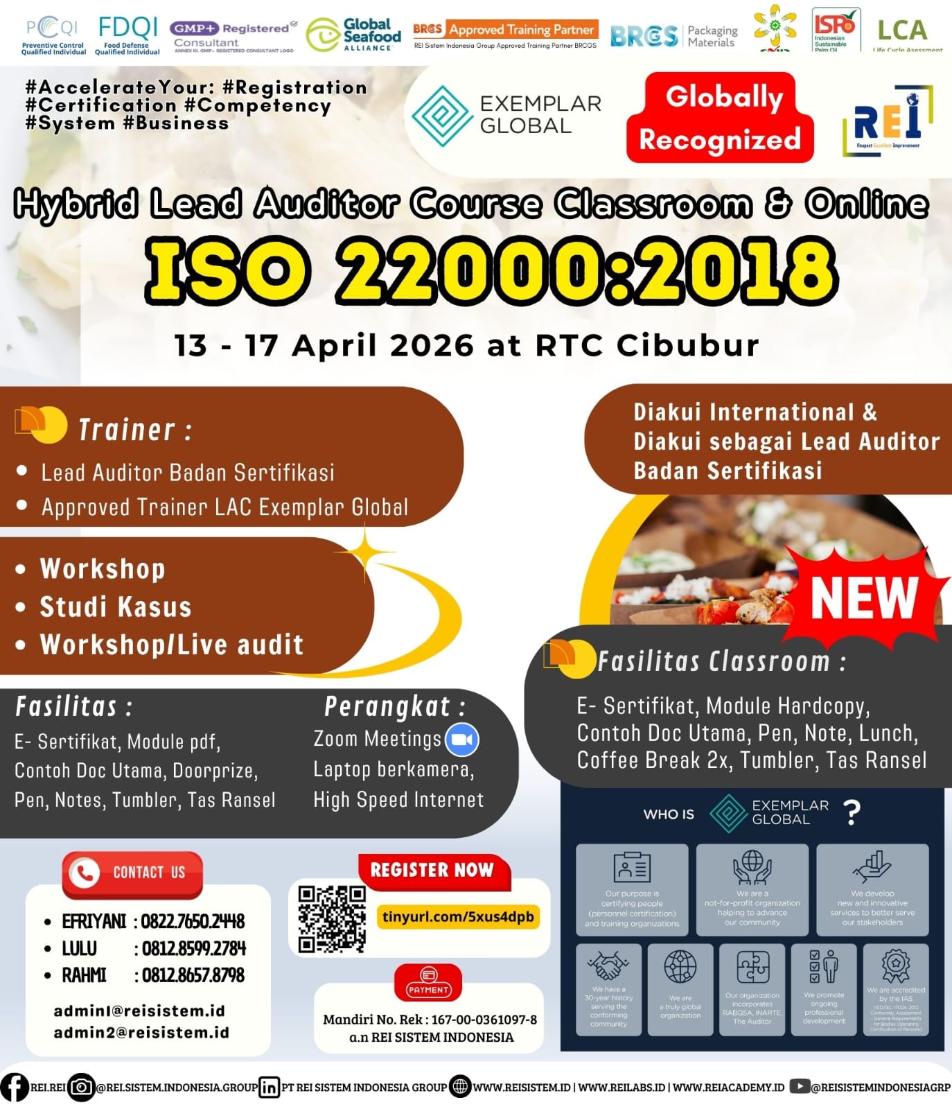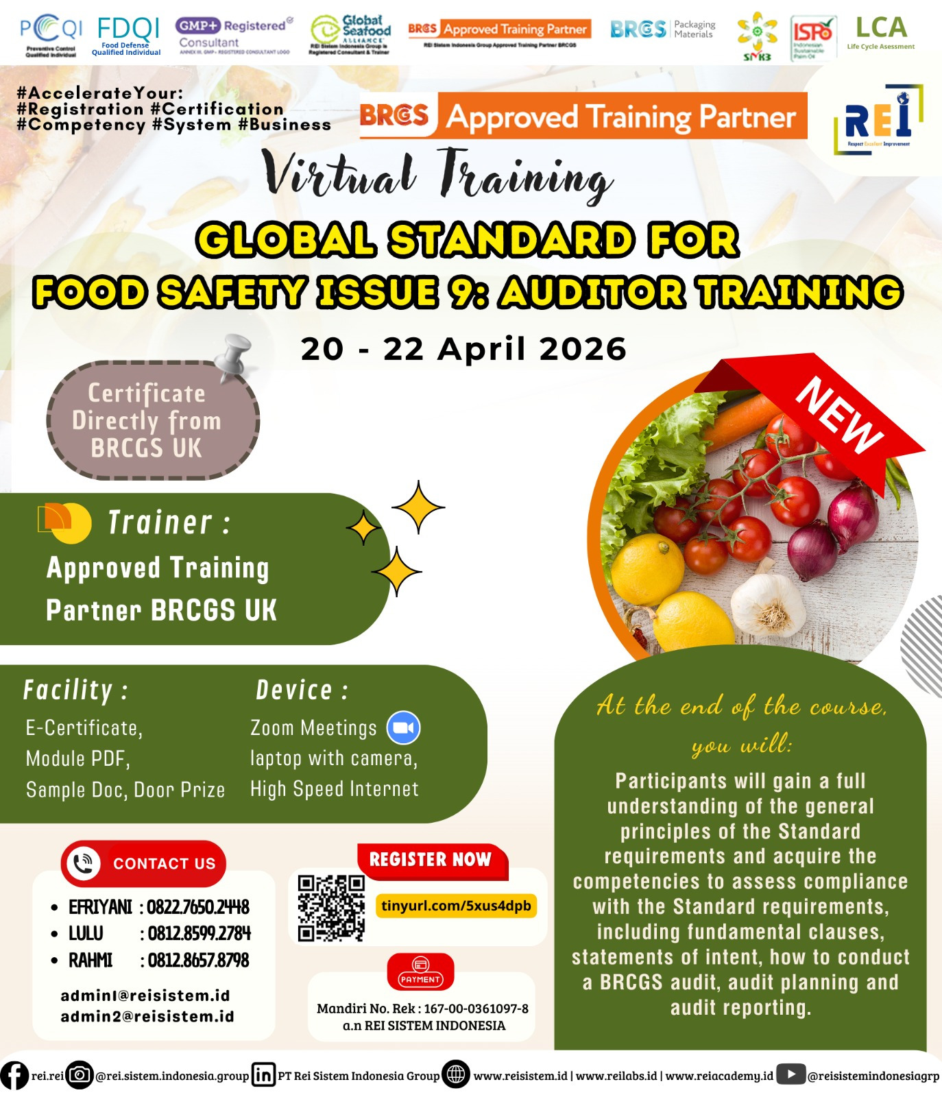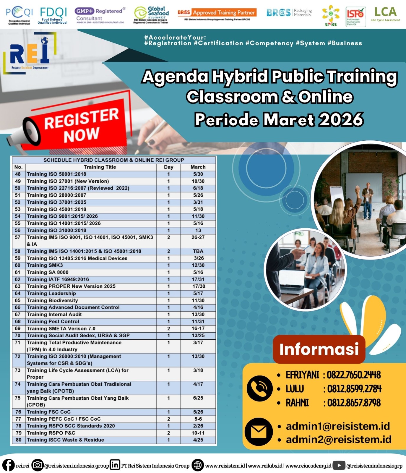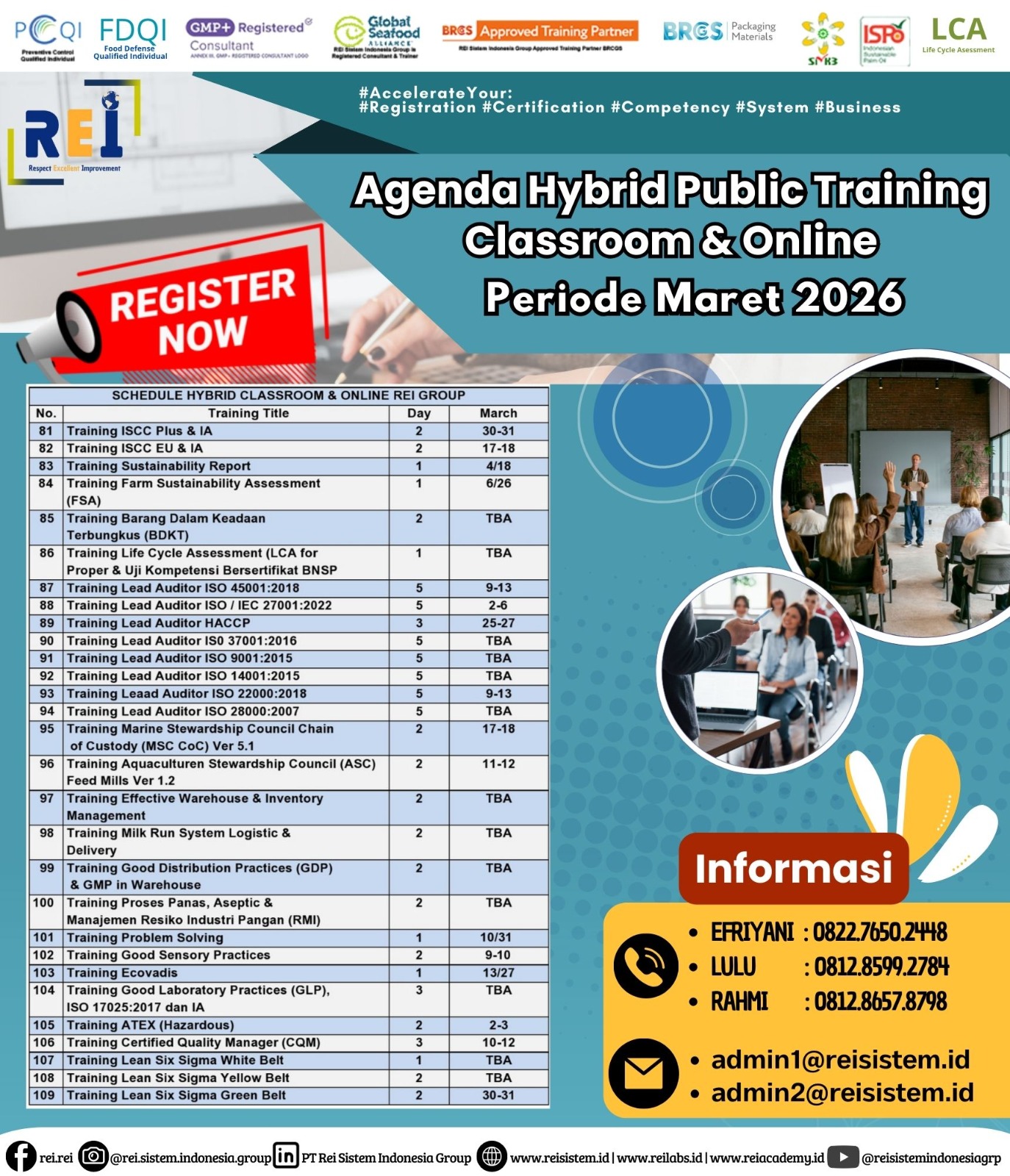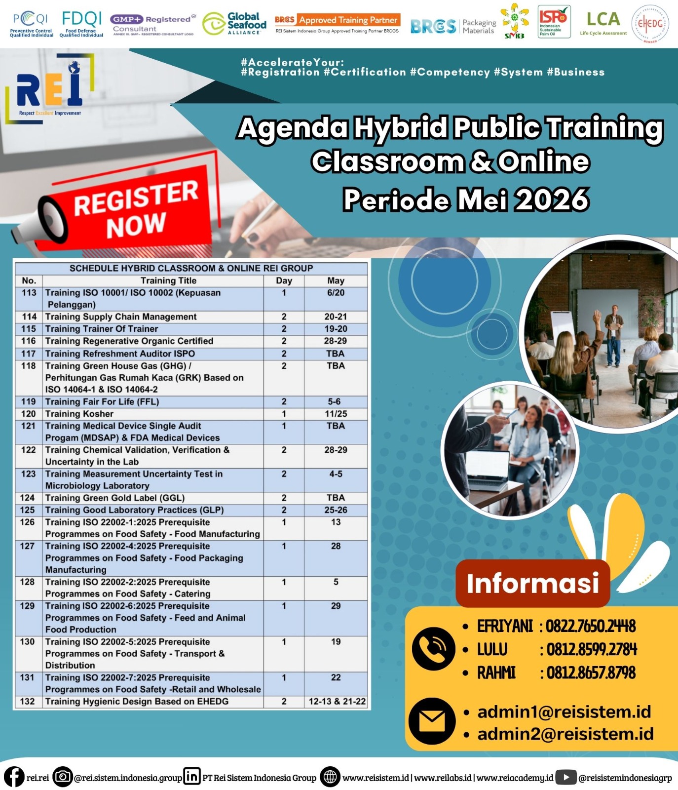 We can support many personnel certification such as PCQI US FDA Recognized, FSSC Lead Auditor Approved FSSC Netherlands, Lead Auditor IRCA CQI, SMK3,etc .